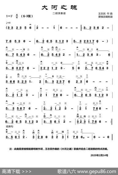 大河之魂(二胡演奏谱)|景楼改编大河之魂(二胡演奏谱)作曲:…